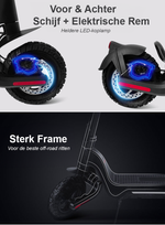 De SturdyMove S9+ is uitgerust met 10-inch off-road banden die moeiteloos omgaan met diverse terreinen. Of je nu over ruw terrein of hobbelige paden rijdt, de banden zorgen voor stabiliteit en grip. Het voor- en achterveringssysteem absorbeert schokken en zorgt voor een soepele rit, zelfs op de meest uitdagende ondergronden.